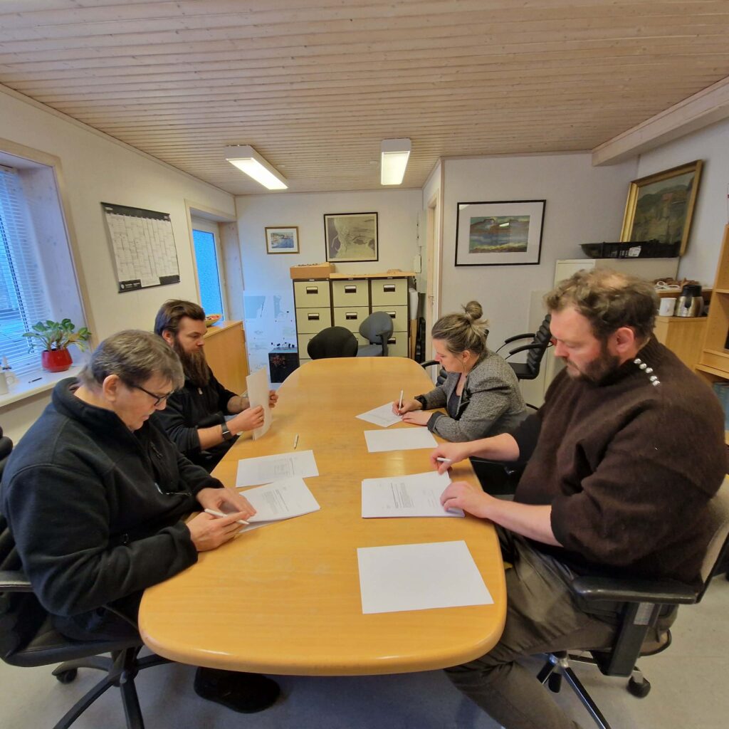 Á myndini síggjast Anfinnur Kruse og Tonny Kruse fyri Búð Sp/f saman við Jógvani í Skorini og Tove Kruse Samuelsen fyri Eiðis kommunu.